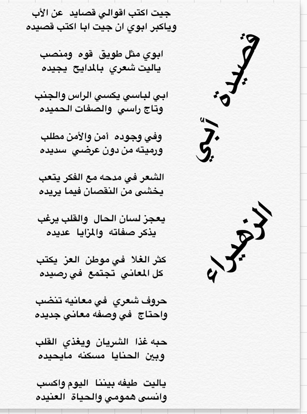 الزهيراء على تويتر قصيدة أبي جيت اكتب اقوالي قصايد عن الأب وياكبر ابوي ان جيت ابا اكتب قصيده ابوي مثل طويق قوه ومنصب ياليت شعري بالمدايح يجيده ابي لباسي يكسي الراس والجنب