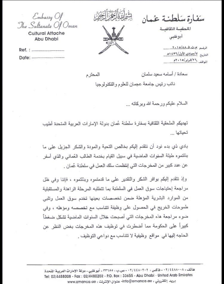 Ajman University בטוויטר خطاب رسمي من الملحق الثقافي الع ماني يعزي سبب إيقاف طلبة السلطنة بجامعة عجمان الى تشبع سوق العمل وليس لتدني المستوى Http T Co Fwgvydl9yy