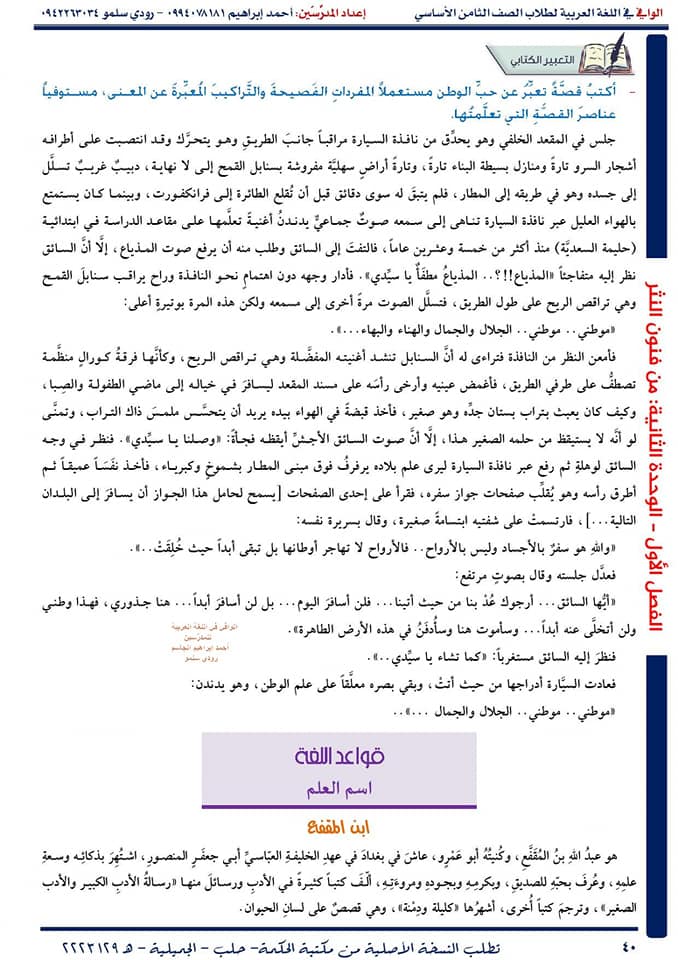 الصف الثامن الوحدة الثانية عنوان الدرس التعبير الكتابي وقواعد اللغة اسم العلم